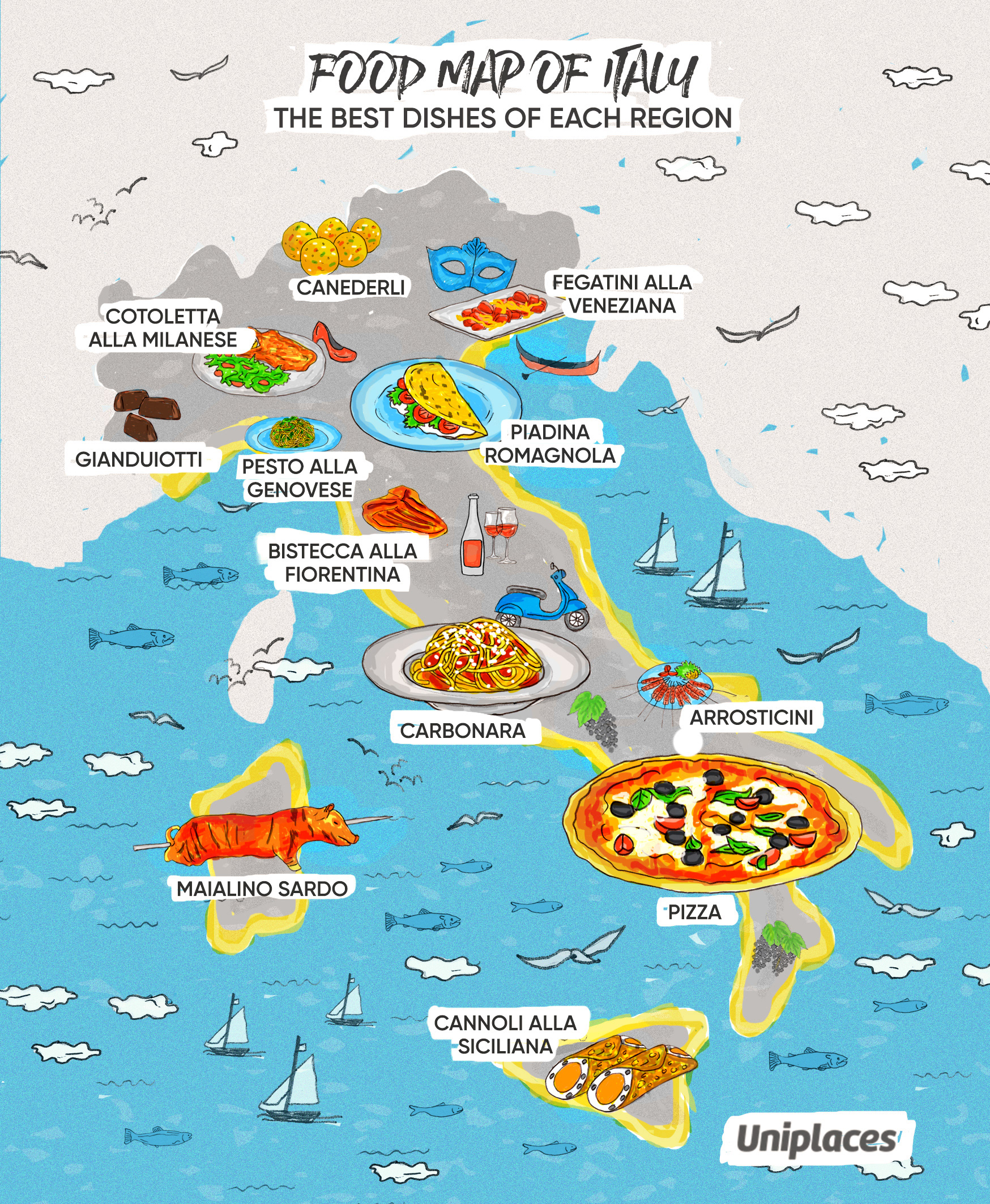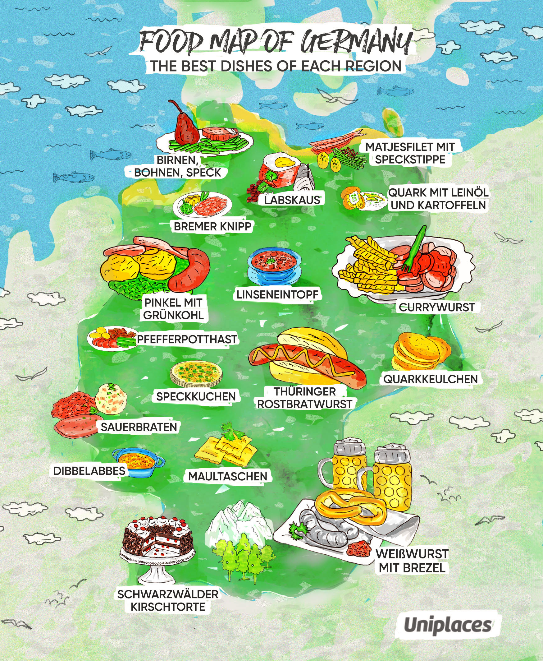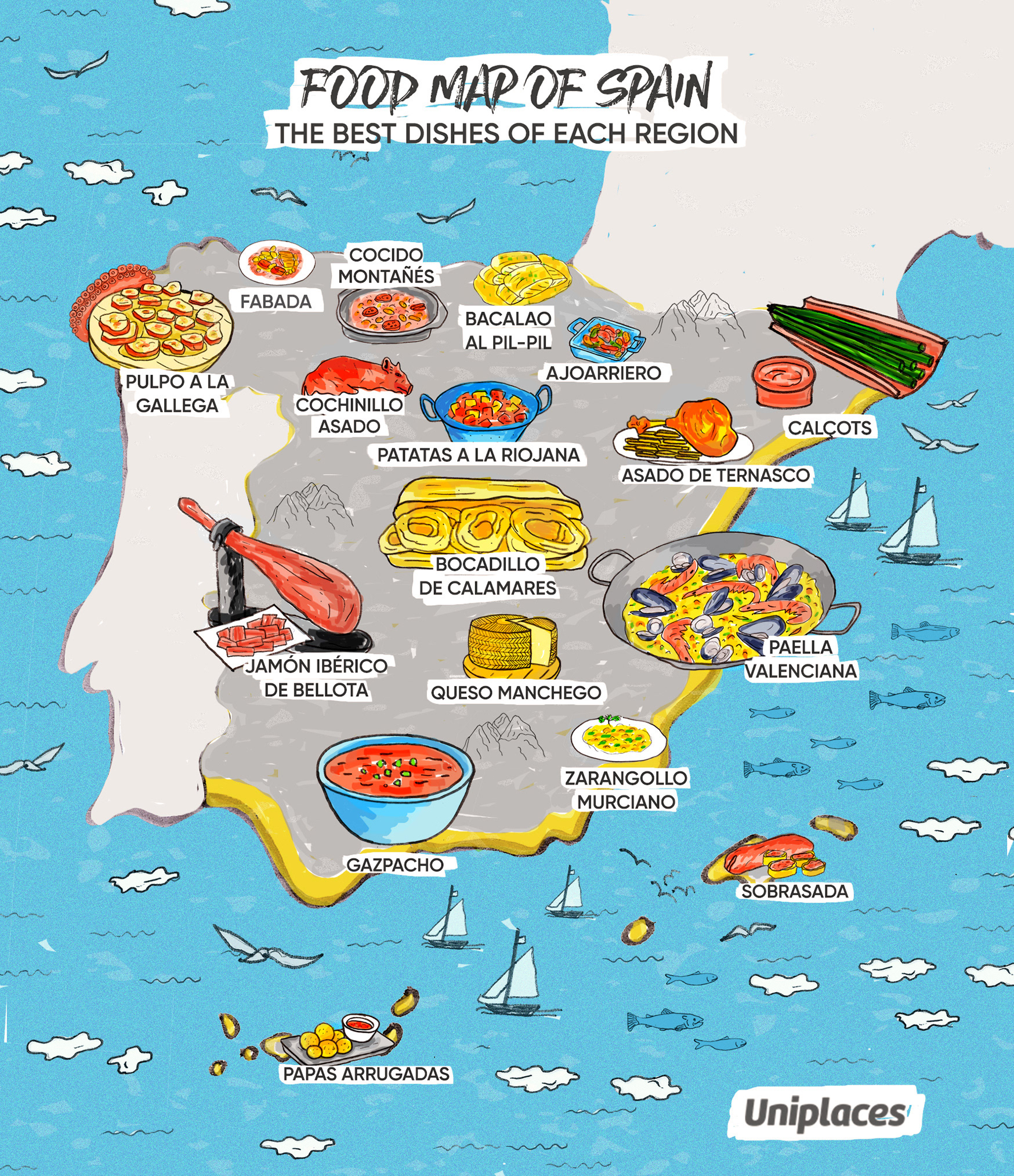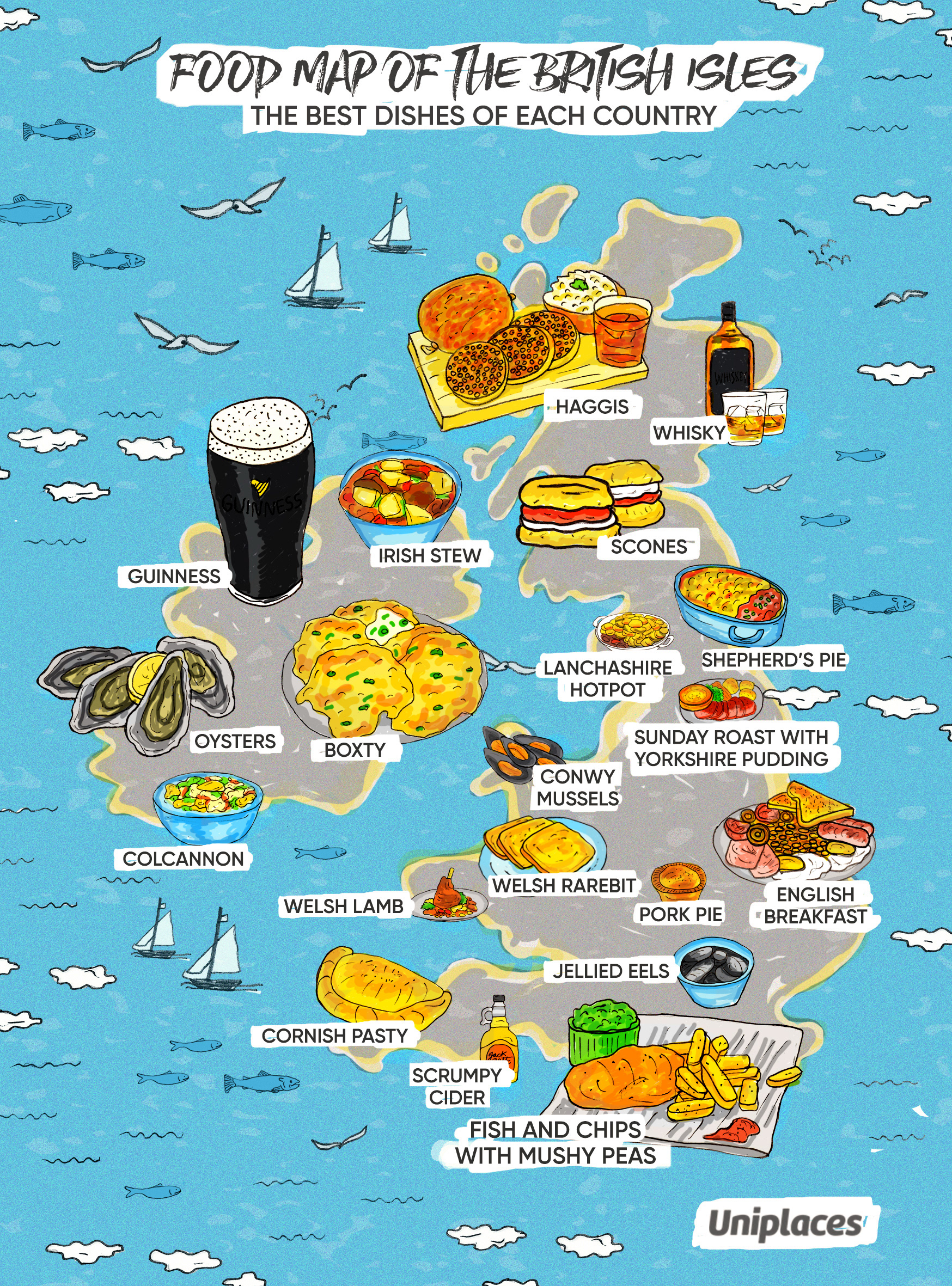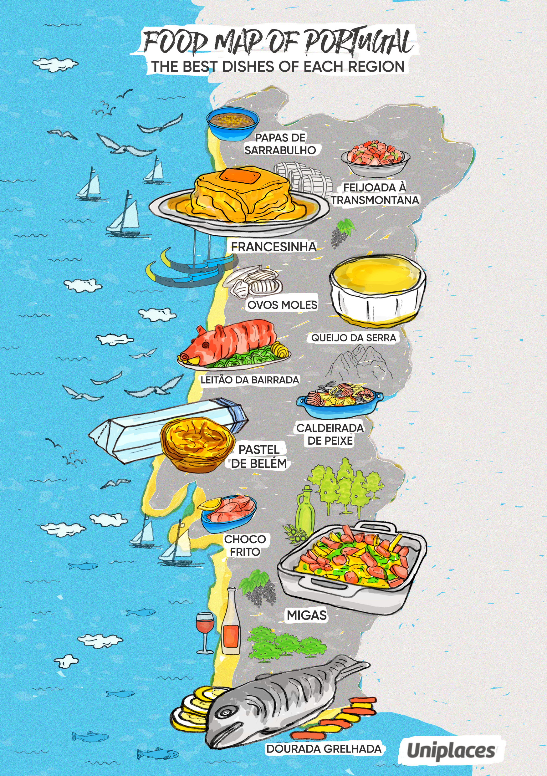 Food Map Illustration collection commissioned by Uniplaces depicting the most famous dishes for the following countries: Portugal, Spain, France, Germany, Italy, UK, and Ireland. The illustrations where shared on the blog and social media and went viral on Facebook. Powered by @imaginarythinking